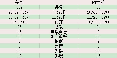 赛前相关 小组赛交锋时,美国队以29分优势击败阿根廷。吉诺比利坦言:“阿根廷此战或许只有5%的争胜机会,但会全力以赴。”美国队众将均表示了对赢下比赛的信心,小组赛对阿根廷时腹股沟挂彩的安东尼尤其强调“要狠狠揍他们”,老K教练则给出告诫:“阿根廷具备击败美国的实力。” 比赛回放 首节:科比单节11分 詹皇追防大帽 开场后斯科拉连入两球,科比命中远投也表演背身灌篮;随着保罗射入三分球,美国队外线威力提前体现——科比又连入两个三分球,美国队18-6建立两位数优势。科比首节得到11分。但此后德尔菲诺与吉诺比利相继远投得分,詹姆斯对坎帕佐送出追防大帽也未能压制阿根廷,阿根廷一度将分差缩小到2分。首节结束前韦少与德隆相继入球,美国队24-19领先。 次节:德尔菲诺开飙 妖刀压哨远投 次节前段斯科拉又挑篮入球,詹姆斯与乐福相继内线得分后,德尔菲诺连入远投率阿根廷追至27-30。詹姆斯此后冲击内线连入3球,并完成打三分,带动美国队37-27拉开比分。而单节得到11分的德尔菲诺再次命中远投。次节后段涨分对峙中科比、安东尼与杜兰特相继得分,吉诺比利则命中压哨三分球,半场结束美国队47-40领先。 三节:妖刀对科比打三分 杜兰特远投发威 吉诺比利在第三节又率先飙入远投,美国队由保罗、钱德勒相继涨分;阿根廷阵地战已显艰难,但吉诺比利仍以犀利突破对科比打三分。随着杜兰特相继射入3个三分球,美国队终是将比分拉开;持续冲击内线的詹姆斯更表演了切入重扣打三分。阿根廷已难相持,三节结束时美国队74-57领先。 末节:甜瓜表演三分球 韦少意外受伤 随着乐福篮下偷袭得手,美国队在末节前段建立20分以上优势。阿根廷将吉诺比利换下后,美国队进攻更进入表演氛围——安东尼接连射入3个三分球,个人完成9-0攻势后美国队已93-64领先。此后美国队展开轮换。斯科拉虽对钱德勒打三分,阿根廷已无力回天;钱德勒也在保罗助攻下回敬空接打三分。不过美国队也出现意外,韦少扭伤后直接回到更衣室。最终美国队109-83奏凯。 先发阵容 美国:钱德勒、詹姆斯、杜兰特、科比、保罗 阿根廷:斯科拉、诺西奥尼、德尔菲诺、吉诺比利、普利济欧尼 转播到腾讯微博