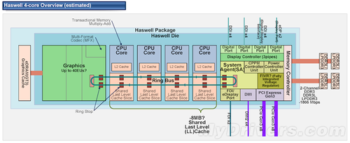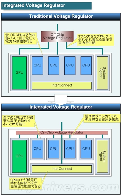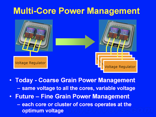 在性能和竞争都无压力、移动趋势越来越明显的情况下,Intel已经悄然改变了处理器研发策略,将重点从提升性能转向降低功耗、提高能效。下一代的Haswell虽然不会升级制造工艺,但会从架构和技术上作出努力,特别是会整合稳压器模块(VRM),改进处理器供电的精细度,并在不影响性能的前提下降低功耗。 目前,稳压器和各种供电IC都安置在主板上,而为了加强处理器供电(更为了增加卖点),供电电路相数不断猛增,制造成本和占用空间也水涨船高,但都达不到Intel想要的供电水准。 为此,Intel特别研发了一种特殊的可编程芯片,内有20个供电单元(power cell)。每个单元都是非常迷你的稳压器,长宽分别只有1.8毫米、1.6毫米,面积不过2.8平方毫米,但能够提供最高25A电流(具体看功耗限制)、16相供电电路,可编程切换频率30-140MHz,因此整个芯片理论上可支持最多320相供电,能够达到极其精细的供电调整,而整个芯片的尺寸为12.977×8.144=105.7平方毫米。 什么3x、4x相主板供电这下都傻眼了吧。 Intel将这种芯片称为整合稳压器(IVR),会将其与Haswell处理器内核封装在同一块基板上(俗称的“胶水封装”),制造工艺也是22nm。 有了这种整合稳压器,Haswell就可以独立、精准地控制每个CPU核心、GPU核心、系统助手(PCI-E和内存控制器等)的供电、功耗,甚至能够照顾到板载稳压器无法顾及的互连总线,从而灵活地降低功耗,且不损失性能。举例来说,Haswell可以在视频播放期间将所有CPU核心挂起,但不会挂起环形互联总线,只留下GPU核心工作的同时,保证总线的全速运行,视频播放依然会很流畅。
