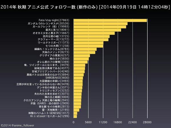 排名第一位的是《Fate/stay night》。相信绝大多数动漫迷对于这部作品都不会感到陌生。该系列根据同名游戏改编,而此后TV动画、剧场版等多种媒体的攻势也让如今的宅人圈中出现了一大批“菲特今晚留下来”的狂热粉丝。本次动画将走“Unlimited Blade Works”路线,并将分割为2季播出,第1季将于同年10月4日播出,第2季预定于2015年4月播出。这一次主人公们又将在动画当中展现他们的魅力,赢得大批粉丝关注也就在情理之中了吧? 《高达G复国运动》排名第二。本作品光是凭借一句“富野由悠季大光头时隔12年再度出山啦!”就足够吸引眼球了。而且这一次光头也在作品造势上不遗余力,他反复强调“这是一部脱离高达的作品”、“大人就不用看了,看了也没用”,并且还终于如愿以偿地将厕所安装进了机器人当中。相信无论对于高达迷还是普通动画观众而言,究竟这一次的《G复国运动》会是富野再度封神的经典,还是验证光头“廉颇老矣”的例证,都值得我们关注。 排名第三的作品是《临时女友》。这部作品也为动漫界带来了一种全新的模式——剧情?画面?人设?你们不用关心这些问题,光是请来的声优数量就足够闪瞎眼了!目前官方正在以每天更新的频率曝光第五弹加盟声优的名单,而但凡我们能够想到的女性声优名字,几乎全部都将在本作品中闪亮登场。究竟这么多人要如何安排戏份呢?恐怕只有看了才知道吧! 日本的ACG作品对于一百多年前的开国总是有着执着的热情。而这一次《笑对阴天》获得第四名也恰恰证明了这个事实。本作品以摆渡人·代代供奉大蛇的昙天神社三兄弟为中心,讲述了维新时期各式各样的现实与未解之谜交错、潇洒而奢华的故事。作品邀请到了原口浩、高桥悠也、池之上由纪等知名动画人加盟制作,而中村悠一、梶裕贵、樱井孝宏、铃村健一等名字也足够让观众有了观看的理由。 至于八田鮎子原作漫画改编的《狼少女与黑王子》成为了第五位的赢家。作品中,没有恋爱经验的篠原艾莉卡阴差阳错地邂逅了腹黑抖S男佐田恭也,在假扮情侣的过程当中发生一段段喜闻乐见的爱情故事。虽然从设定而言并不算特别新奇,但是青春校园恋爱的故事永远是ACG作品的主旋律之一。希望本作品也能给大家带来感动。 除了上述作品之外,《四月是你的谎言》、《火星异种》、《境界触发者》、《七大罪》、《银仙》等也都排名前列。 【2014年秋季新番官推关注量排名】 第一位 《Fate/stay night》 27863人 第二位 《高达G复国运动》 20526人 第三位 《临时女友》 19993人 第四位 《笑对阴天》 181061人 第五位 《狼少女与黑王子》 15667人 第六位 《四月是你的谎言》 13725人 第七位 《火星异种》 13272人 第八位 《境界触发者》 11373人 第九位 《七大罪》 11258人 第十位 《银仙》 8783人 第十一位 《天体原理》 8273人 第十二位 《灰色的果实》 6257人 第十三位 《拂晓的尤娜》 5830人 第十四位 《我家浴室的现状》 5369人 第十五位 《我、成为了双马尾》 4479人 第十六位 《结城友奈是勇者》 4377人 第十七位 《甘城光辉游乐园》 4240人 第十八位 《日常系的异能战斗》 3894人 第十九位 《白箱》 3600人 第二十位 《大图书馆的牧羊人》 3493人 第二十一位 《关于完全听不懂老公在说什么的事》 3478人 第二十二位 《电器街的漫画店》 3371人 第二十三位 《TRINITY SEVEN 魔道书7使者》 3232人 第二十四位 《遗失的未来》 3075人 第二十五位 《魔弹之王与战姬》 3075人 第二十六位 《CROSSANGE天使与龙的轮舞》 2945人 第二十七位 《牙狼〈GARO〉-炎之刻印-》 2909人 第二十八位 《寄生兽》 2815人 第二十九位 《爱·天地无用!》 2195人 第三十位 《巴哈姆特之怒》 1417人 第三十一位 《世嘉少女》 1299人