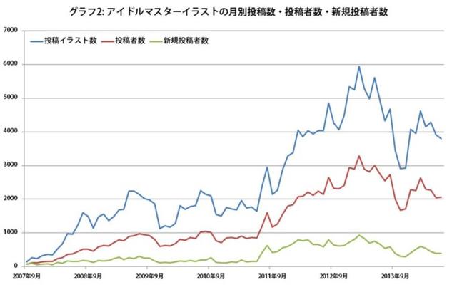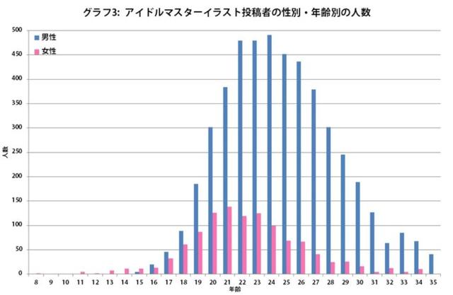 在活跃于pixiv的《偶像大师》相关作品的投稿者中大约七成都是男性。其中六成的投稿者公开了自己的性别情报,两成的投稿者公开了自己的性别以及年龄。从公开性别以及年龄的6500名投稿者数量上来看,和《东方系列》相同,20岁前半的男性占据了多数,由此向两侧展开人数不断减少,整个数据图呈现小山状起伏。