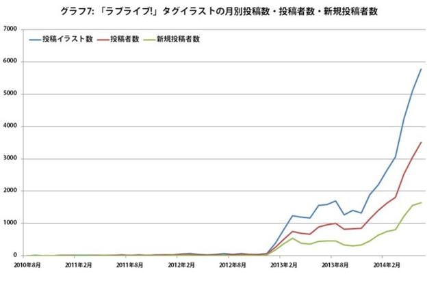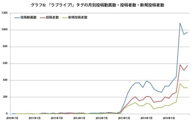 ■一举成名!新生代偶像剧《LOVE LIVE!》 《LOVE LIVE!》是由日本知名动画制作公司SUNRISE、音乐出版商Lantis以及 ACG 月刊杂志电击G'smagazine联手打造的二次元偶像企划,于2013年1月6日开始播放TV动画第一季(全13话),2013年3月31日完结;2014年4月6日播出第二季(全13话),2014年6月30日完结。讲述的是少女们为了拯救废校危机而开始踏上校园偶像之路的故事。 虽然早在2010年开始《LOVE LIVE!》就以LIVE、游戏以及广播剧的形式出现在了大众面前,但真正意义上被观众认可的还是在2013年动画开播之后。从下图中我们可以看到自从2012年底动画化决定之后,《LOVE LIVE!》在NICONICO上的投稿数就飞速增长;动画第二季开播后更是在此基础上将投稿数翻了一番。名副其实的“一举成名”。