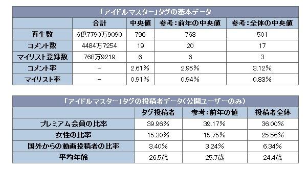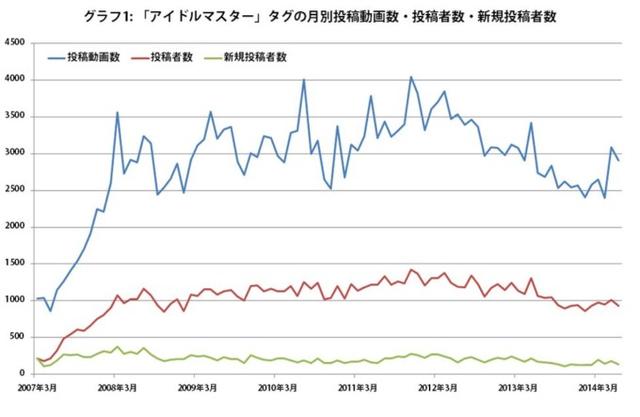 ■《偶像大师》在pixiv中依旧坚挺 与此前说的一样,《偶像大师》最初只是NAMCO公司于2005年7月26日发售的街机平台养成类游戏,由于其人气不断增长,各类平台的游戏接连推出,动画得到了开播,可以说是日本二次元偶像作品的“大姐头”了。另外,《偶像大师》在日本最大的视频网站NICONICO中也拥有相当高的人气,同时,它也和《东方系列》、《VOCALOID》一同在pixiv以及同人展中常年保持着最高的活跃度。 这次让我们来一起看看《偶像大师》在NICONICO以及pixiv中的表现吧。首先让我们注目下图,附有《偶像大师》标签的视频投稿从2007年开始就呈现较多的态势,此后随着各类作品的不断出现,人气一直居高不下。在《偶像大师2》发售、TV动画放送、《偶像大师Cinderella girls》发布等诸多时点里人气都会得到小幅上涨,近年来由于新作较少,整体呈现出下滑的趋势。但伴随着2014年动画剧场版的上映、游戏《偶像大师 全力以赴》的发售,四月开始人气再度飙升。至今为止,NICONICO上的《偶像大师》标签作品共有25万3500件,参与投稿人数达1万8500人。