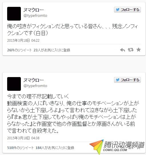 “我要说的话,可能大家会觉得只是虚构的。但很遗憾,这都是事实。” “我来说一下迄今为止遇到的各种无可理喻的事情。检查动画的人会对我说:‘突然我的工作热情就没啦,你给我土下座道歉吧。’而我一边哭一边土下座的时候,他又说:‘哎呀就算你土下座了,我的情绪还是调动不起来啊。’这样的事情当着作画室里其他作画导演跟原画师的面发生,让我都想过去自杀。” “而在土下座事件之后,有某个知名的作画人员来到制作室里笑着对我说:‘哎,你还好吧?能不能问你一个问题哈?在土下座的时候,你是什么心情啊哈哈?’听到他的话语,我再度产生想要自杀的念头。而这个人现在应该是去A-1了吧。不,肯定是在那里。我无法原谅那种人,那个死胖子。” “不过啊,恐怕我遭遇到的事情还算是小场面了……毕竟动画业界就是由大量临时工组成的呢……” “毫无疑问,业界自杀的人有半数并非因为太强的工作压力,而是受困于职权骚扰才选择了去死。”