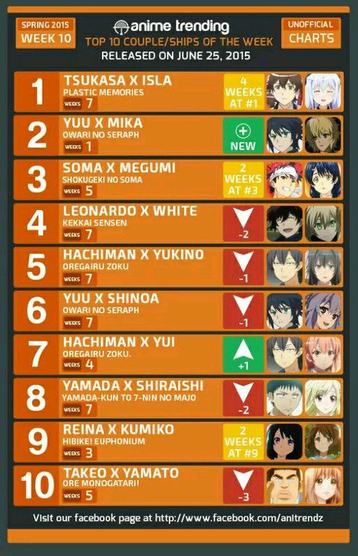 第一位 水柿司&艾拉(《可塑性记忆》) 第二位 优一郎&米迦尔(《终结的炽天使》) 第三位 幸平创真&田所惠(《食戟之灵》) 第四位 莱昂纳多&怀特(《幻界战线》) 第五位 比企谷八幡&雪之下雪乃(《我的青春恋爱物语果然有问题》) 第六位 优一郎&柊筱娅(《终结的炽天使》) 第七位 比企谷八幡&由比滨结衣(《我的青春恋爱物语果然有问题》) 第八位 山田龙&白石丽(《山田君与7人魔女》) 第九位 高坂丽奈&黄前久美子(《吹响!上低音号》) 第十位 刚田猛男&大和凛子(《俺物语!!》)