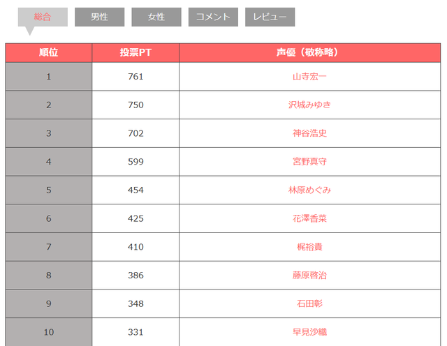 第一位 山寺宏一 761票 第二位 泽城美雪 750票 第三位 神谷浩史 702票 第四位 宫野真守 599票 第五位 林原惠 454票 第六位 花泽香菜 425票 第七位 梶裕贵 410票 第八位 藤原启治 386票 第九位 石田彰 348票 第十位 早见纱织 331票 第十一位 中村悠一 303票 第十二位 悠木碧 299票 第十三位 钉宫理惠 297票 第十四位 杉田智和 294票 第十五位 松冈祯丞 269票 第十六位 小野大辅 266票 第十七位 斋藤千和 253票 第十八位 野泽雅子 232票 第十九位 铃木达央 227票 第二十位 樱井孝宏 201票 第二十一位 福山润 195票 第二十二位 名冢佳织 192票 第二十三位 田中真弓 178票 第二十四位 神谷明 169票 第二十五位 户松遥 125票 第二十六位 茅野爱衣 114票 第二十七位 平野绫 109票 第二十八位 关智一 94票 第二十九位 子安武人 93票 第三十位 大冢明夫 92票