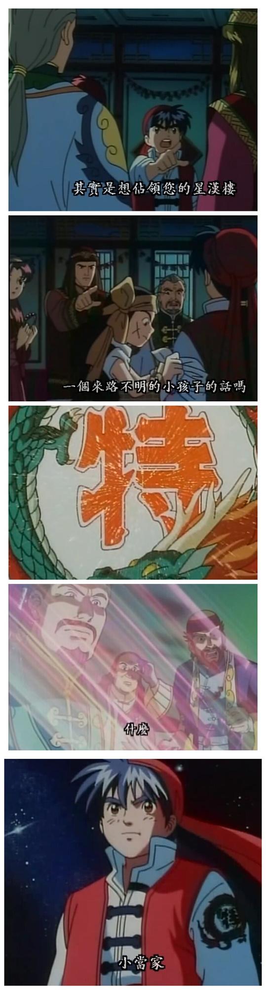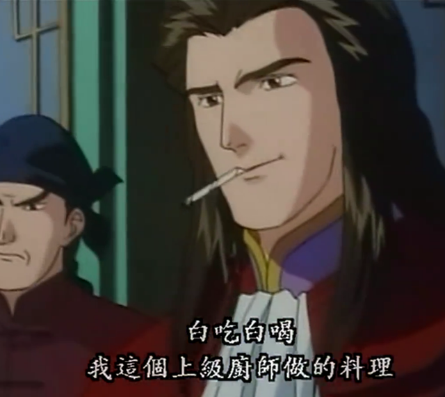 至于小当家方面,还记得当我们小时候打开电视机,看着他在取得特级厨师资格之后都干了什么吗?没错!用毛巾遮住了特级厨师的LOGO,然后开始所谓的修行之旅。 这其中充满了很多槽点。例如“既然要隐藏身份,那为啥不换一件衣服?”“为什么每次都会在秀完厨艺之后‘无意’中暴露身份?”等等。当然了,或许这都是小当家师傅用于装逼的前提而已!就以“银河面”这集为例吧: 一开始的时候,小当家三人组来到了某城镇,因为吃饭不付钱而有幸看到了一位高富帅在装逼: