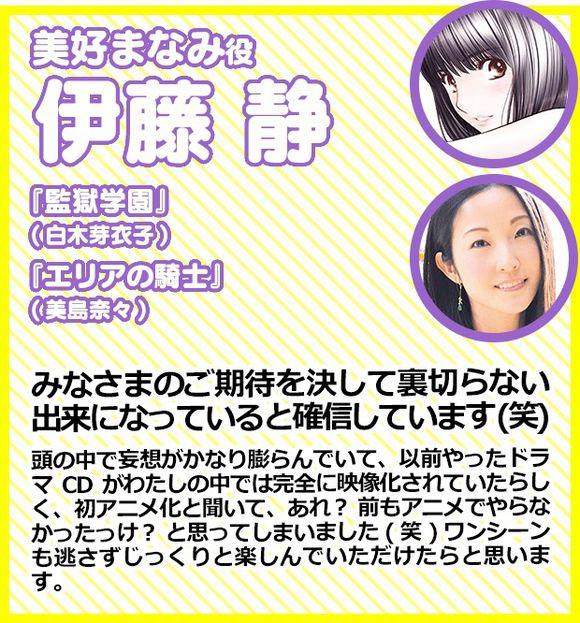 其他声优方面,美好真奈美由出演过《监狱学园》白木芽衣子、《足球骑士》美岛奈奈的伊藤静配音;久保由利香(《在地下城寻求邂逅是否搞错了什么》洛基、《LoveLive!》小泉花阳)的角色为筱崎舞衣;速水真纪由山北早纪配音;中岛的声优是松本健太。并且他们的评论也都送上!