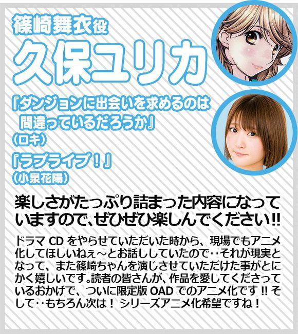 久保由利香:内容方面充满了乐趣,请大家好好期待一下!!在最初负责广播剧的时候,现场也传出了希望动画化的呼声……因此当美梦成真的时候,我对于还能够再为筱崎酱配音感到发自内心的喜悦。因为各位读者喜爱作品的关系,终于有了限定OAD动画化的一天!!并且……当然了!接下来我希望是系列动画的登场!