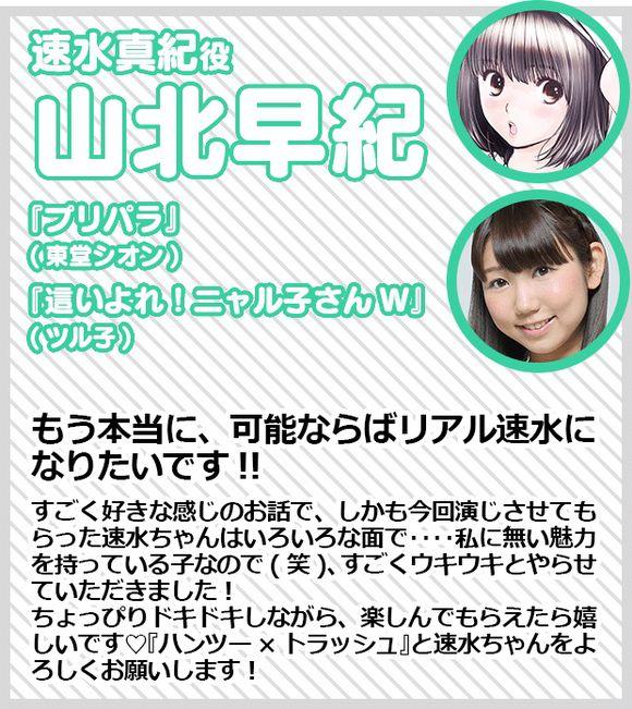 山本真纪:我真的要竭尽全力展现一个真实的速水!!这部作品的剧情让我非常有好感,并且这一次出演的速水酱在各种方面……都有着我不具备的魅力(笑),所以我也情不自禁地接受了任务!作品一方面让人心动,一方面又让人能获得快乐,如果大家也是这样就好了。请对于《青春水球社》以及速水酱多多指教!