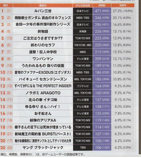 第一位 《鲁邦三世》471票 第二位 《机动战士高达 铁血的奥尔芬斯》346票 第三位 《金田一少年事件薄R》新作系列286票 第四位 《终物语》226 票 第五位 《请问您今天要来点兔子吗??》223票