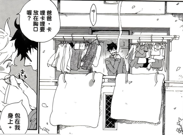 小贝鲁一不高兴就哭,一哭就放电,完全黏住了男鹿。魔界保姆希露迪趁机带着小贝鲁搬进男鹿家,把男鹿全家吓得以为儿子在外面搞出人命了还是未成年外国金发妹。因为地球再没哪个人类比男鹿更凶狠了,男鹿甩不掉这娃,还要时时哄他开心,哪怕大便尿液浇头而下也不敢贸然离开。每次小贝鲁哭完,男鹿都会摸摸小脑袋说男孩子不哭。男鹿啊,其实你是个挺有责任心的奶爸嘛! 三、好父亲要有一手好厨艺!《天真与闪电》犬冢公平