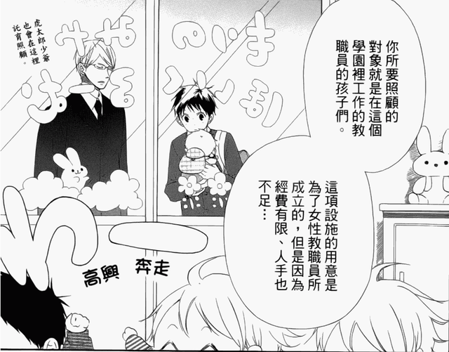 为了展现对女老师的人文关怀,理事长去世的儿子和媳妇曾建议成立保姆社团,招揽学生加入。但对于忙着唱K逛街追星谈恋爱的青春少男少女来说,谁愿意做这种小孩拉屎要擦屁股的体力活,因此保姆室只有毕业生兔田义仁是唯一正式员工。龙一很懂得知恩图报,二话不说带着弟弟投入到男保姆新生代行业中。也许是龙一天生带有奶爸气质,小孩子都很喜欢粘他,上学时还有一串小豆丁浩浩荡荡跟着去。这时,轮到弟弟虎太郎吃醋了。当龙一知道虎太郎因压力太大而发烧时终于忍不住抱着婆婆哭了…… 五、保护欲过强导致儿子没朋友?《抓狂爸爸》鹰司千里