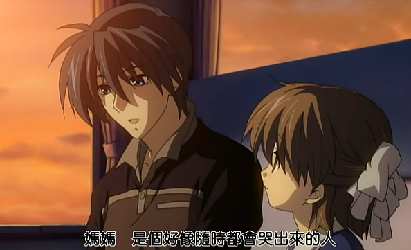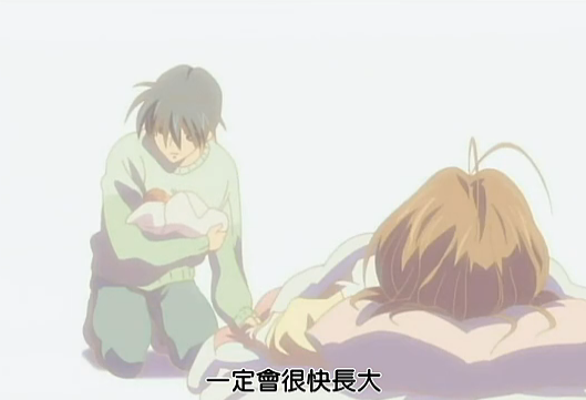 冈崎朋也得母亲在事故中去世,和父亲关系不好。好不容易讨到一个可爱温柔老婆古河渚,却在产后去世。看着幸福从自己身边再次溜走,朋也更加颓废了,把女儿汐丢给外公秋生外婆早苗带,自己用工作来麻木自己,对小孩不闻不问。