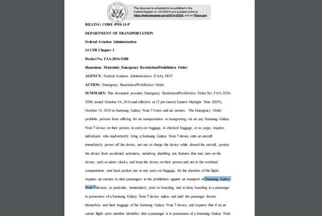 近日,据美国联邦航空管制局FAA(federal aviation administration)公布,他们将发布关于旅客将包含三星的Galaxy Note7在内的违禁物带上飞机追究的法律责任或进行法律制裁的准则,凡是违反本次禁令《Emergency Restriction/Prohibition Order》的旅客,将处以最大10年的监禁或者最大179933美元(大约122万人民币)的罚款。