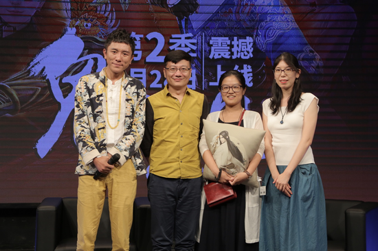 图:从右至左为里巴巴文化娱乐集团大优酷事业群动漫中心制片人、《少年锦衣卫》制片人、总编剧孙甜,获奖粉丝,光合积木创始人、《少年锦衣卫》配音导演姜广涛,柏言映画CEO、《少年锦衣卫》总导演陈柏言