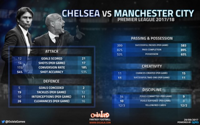 腾讯体育9月30日讯 本周末,英超联赛的一场重头戏是切尔西对阵曼城,这场比赛将在斯坦福桥球场进行。上个赛季,切尔西双杀了曼城,不过本赛季,瓜迪奥拉的球队势如破竹,目前在英超赛场领跑。赛前,著名数据网站oulala盘点了两队在本赛季联赛的16项关键数据,从英媒的判断来看,曼城本场比赛的赢面是非常大的。