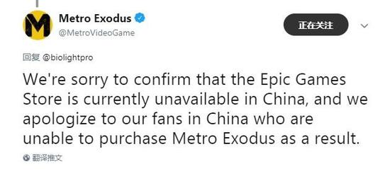 《地铁:离去》因为发行商Deep Silver决定临时取消PC版首发Steam平台,转而独占Epic商店一年,从而引起了许多争议,而这样的操作尤其令国区PC玩家愤慨。因为Epic锁国区的限制,所以之前如果你没有预购Steam版游戏,那么未来这一年几乎都别想在PC上玩到《地铁:离去》了。也无怪乎游戏在近日正式发售后,尽管有许多玩家在Steam商店给予它好评,但大骂发行商和Epic的人也不在少数。 而近日《地铁:离去》官方在Twitter上也进行表态,对无法在PC上玩到《地铁:离去》的中国玩们道歉。